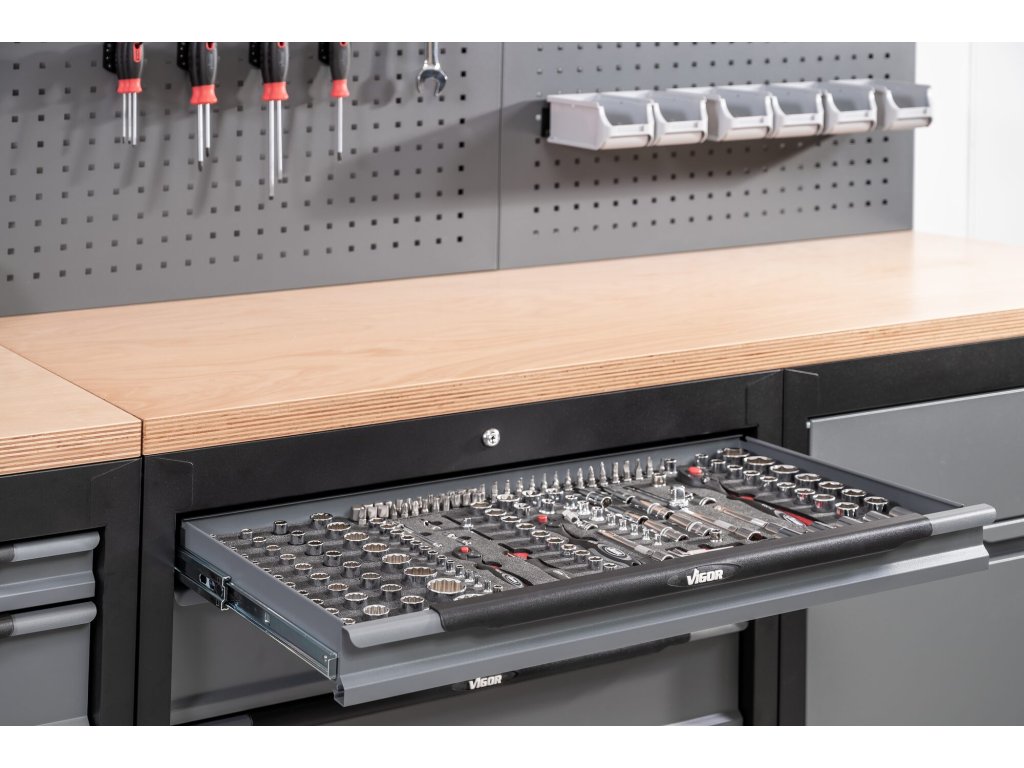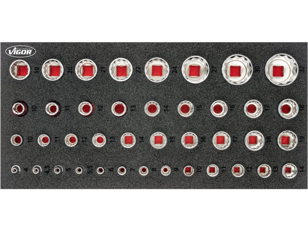 - VIGOR sada nástrčných klíčů je vybavena 42 profesionálními nástroji o velikosti 4 – 32 mm, které jsou uloženy v praktické 2K vložce z měkké pěny.