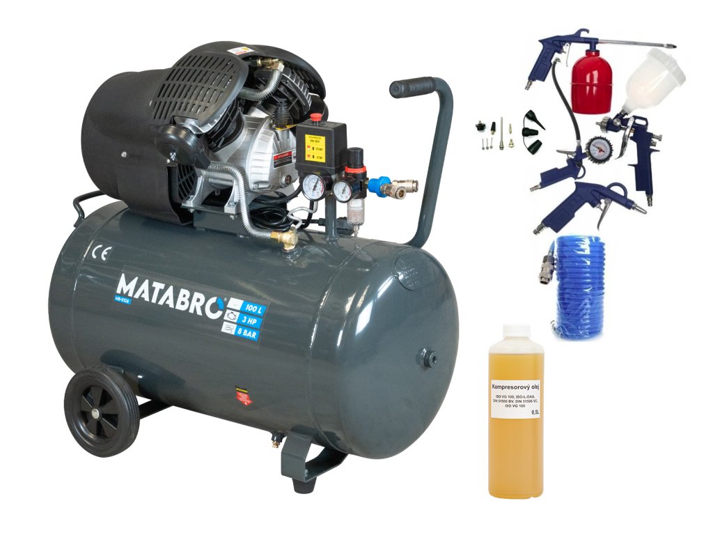AKČNÍ SET SETMB-K108, Olejový kompresor 100l, 230V s odlučovačem a příslušenstvím | 3500W | Matabro