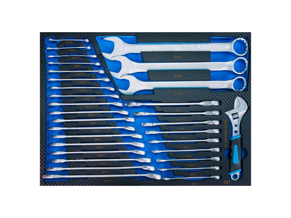 - Vložka do dílenského vozíku velikosti 3/3 obsahuje kompletní sadu očkoplochých a ráčnových klíčů pro každodenní servisní a montážní práce.