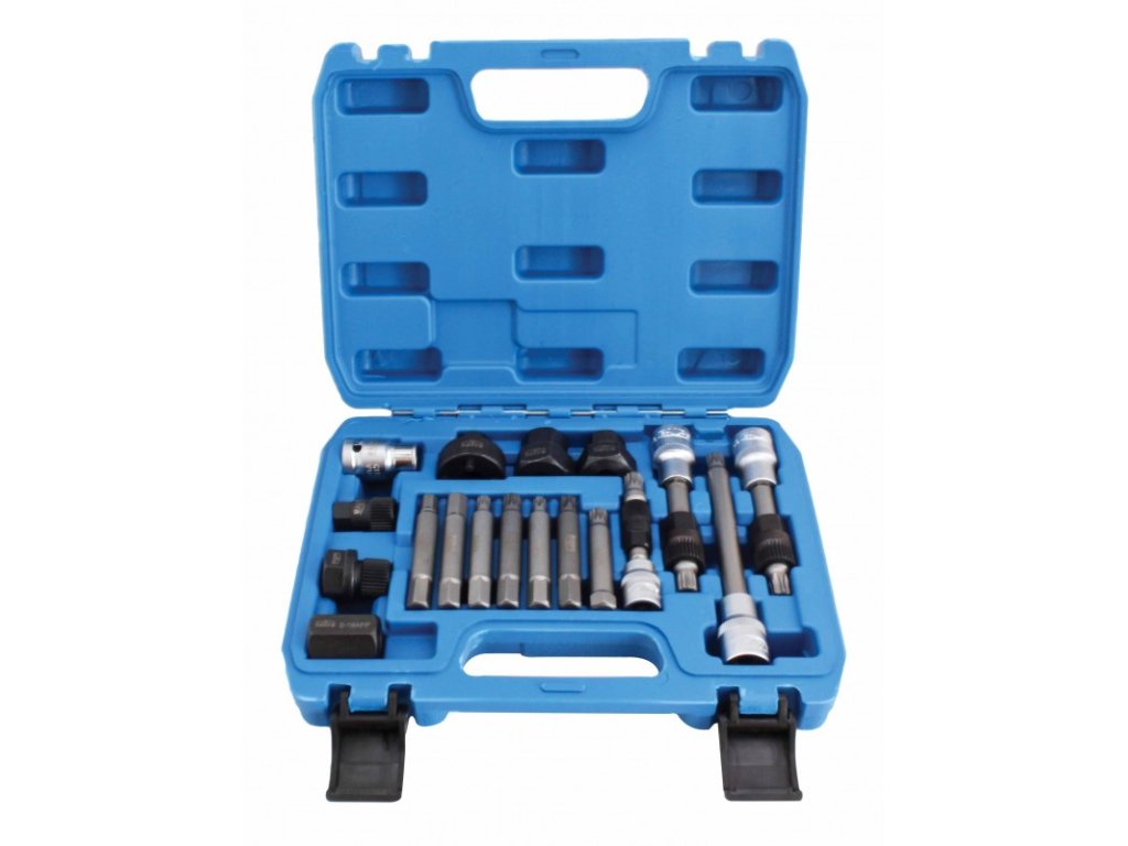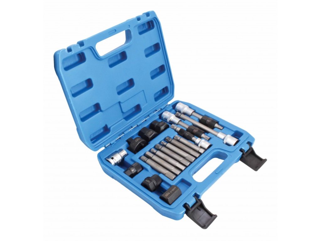 sada nářadí pro demontáž řemenic u alternátorůobsahuje speciální hlavice, klíče i nástrčné hlavice