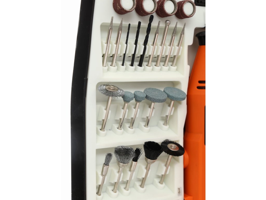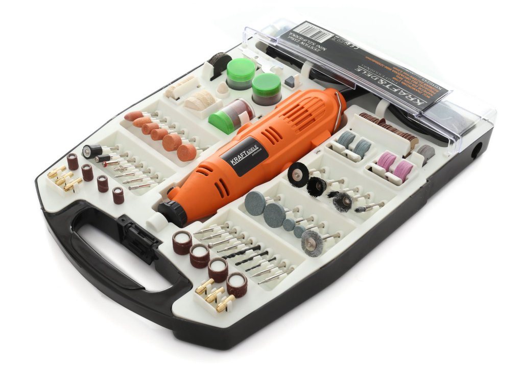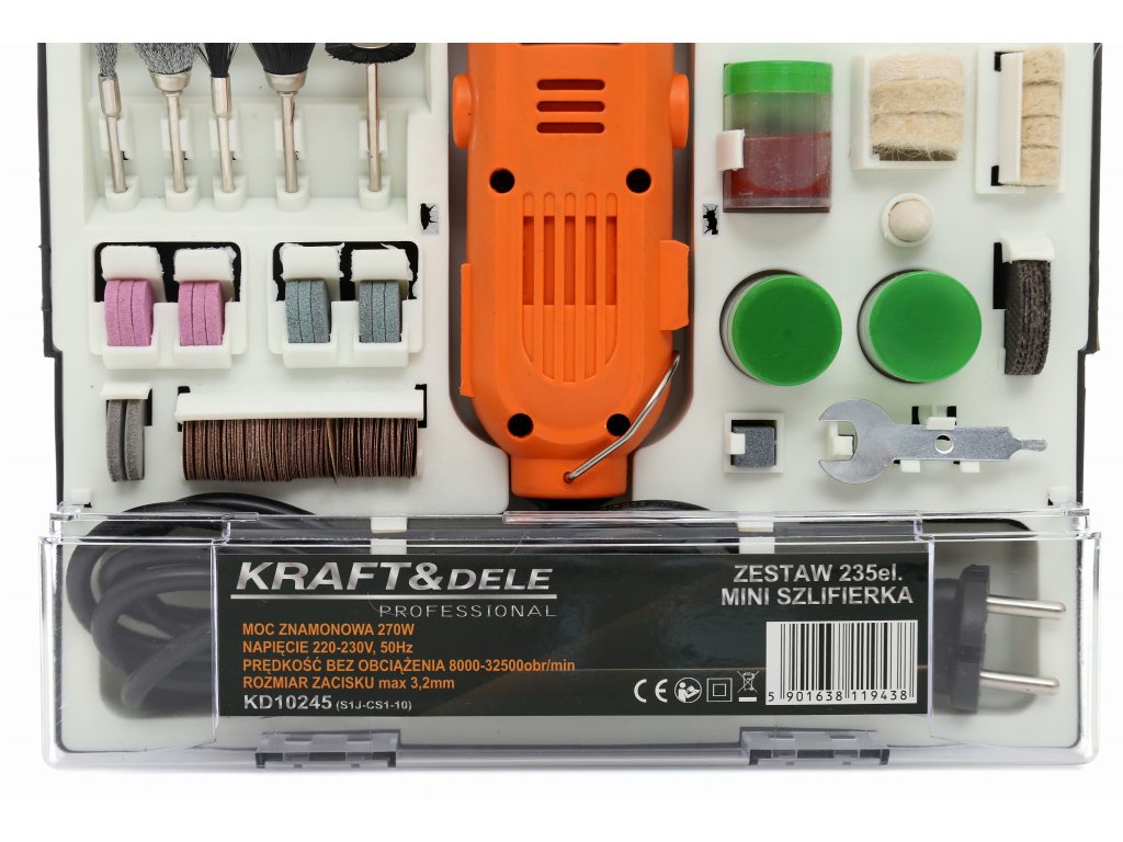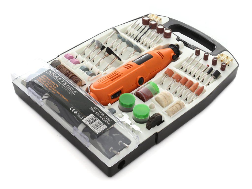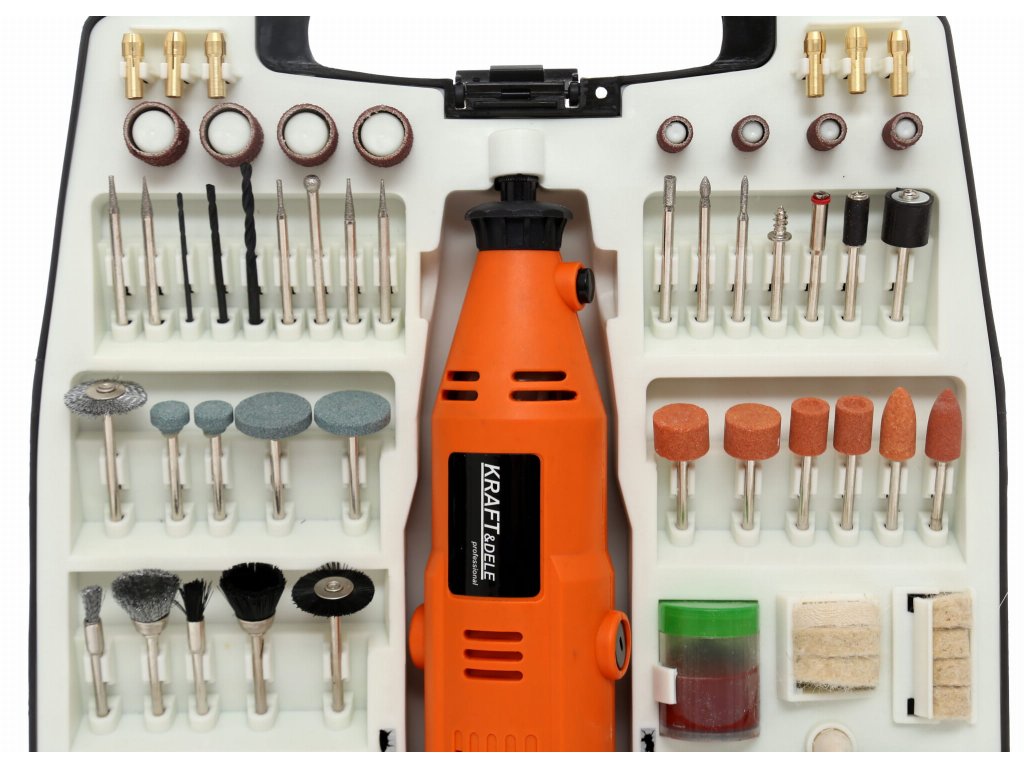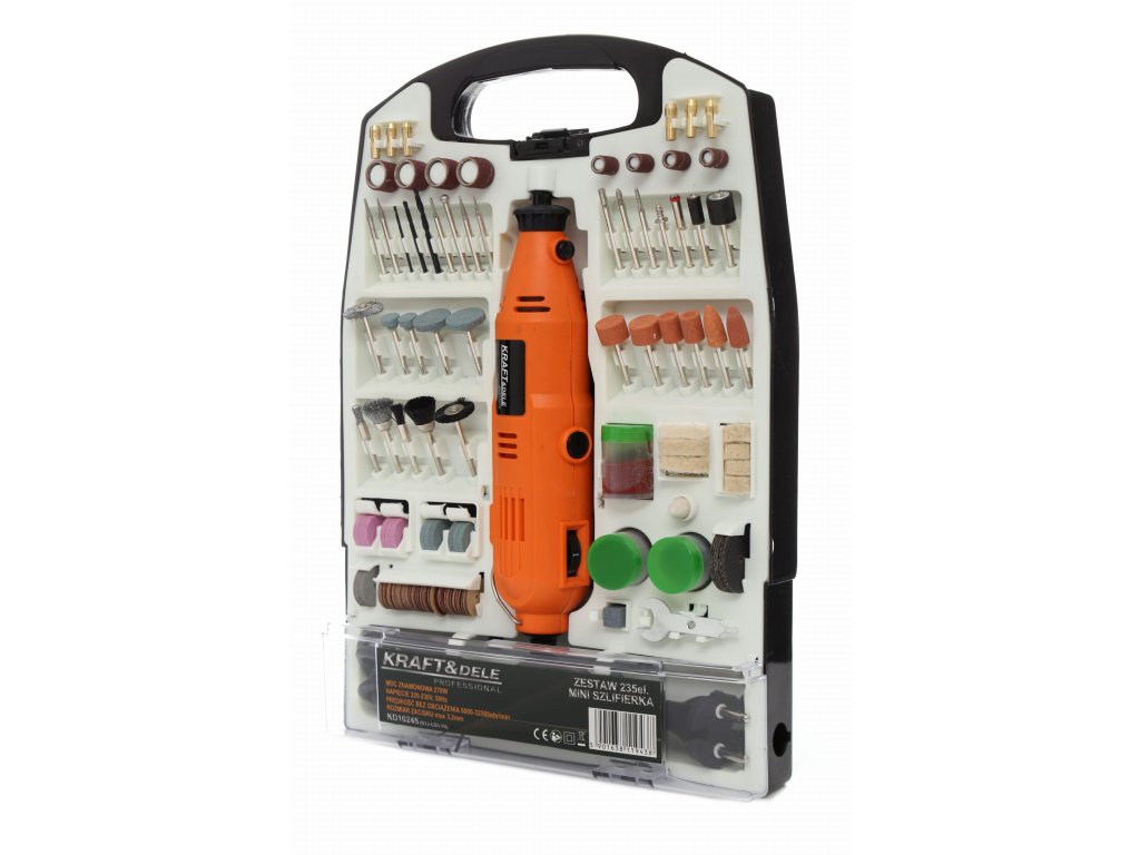 Multibruska KD10245 od značky KRAFT&DELE je univerzální nástroj určený pro broušení, vrtání, leštění, gravírování a frézování. Díky výkonu 270 W a plynulé regulaci otáček v rozmezí 8000–32500 ot./min lze snadno přizpůsobit práci typu materiálu. Sada obsahuje až 235 kusů příslušenství, které umožňuje využití brusky v mnoha oborech – od modelářství až po šperkařství. Kompaktní tvar a ergonomická konstrukce zajišťují pohodlné a přesné ovládání.