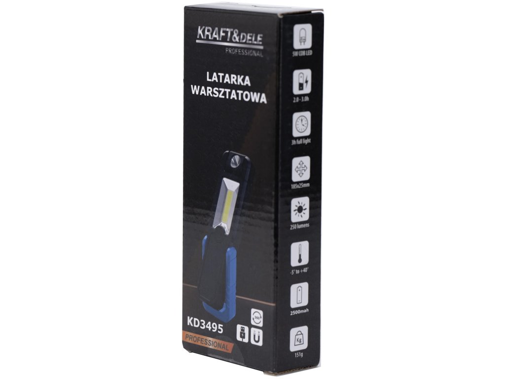 Kraft&Dele KD3495, Dílenská LED svítilna 250 lm s USB nabíjením a magnetem | 5W COB LED, 2500 mAh, 3 hodiny svícení