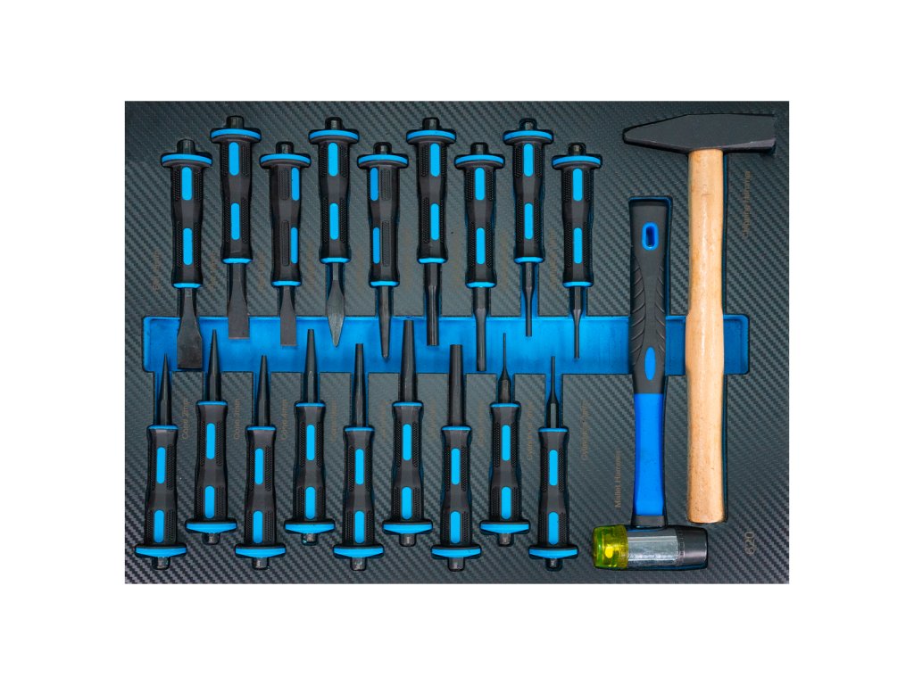 - Vložka do dílenského vozíku velikosti 3/3 obsahuje sadu důlčíků, sekáčů a vyrážečů určenou pro profesionální montážní a servisní práce.
