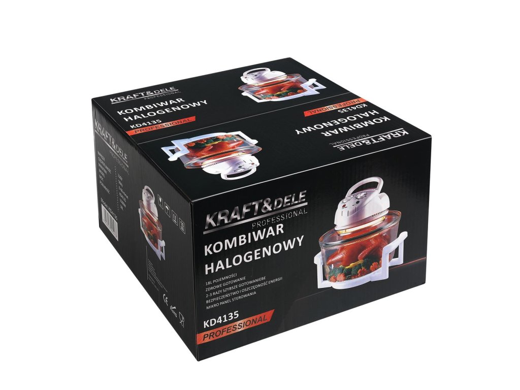 - 18l halogenový konvektomat KD4135 je kompaktní a multifunkční spotřebič značky KRAFT&DELE, který umožňuje pečení, grilování, opékání, vaření, vaření v páře, rozmrazování a ohřívání.