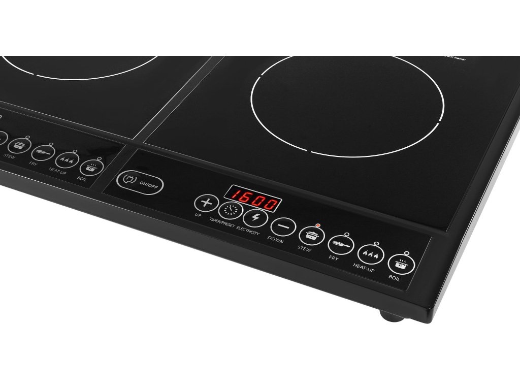Vyberte si výkonnou a energeticky úspornou indukční desku s dvojím varným polem, snadným dotykovým ovládáním, přednastavenými programy a praktickou funkcí timeru vhodnou jak do domácnosti, tak na cesty.