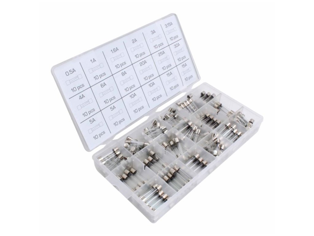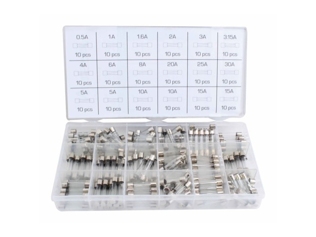 - Sada pojistek: 180 kusů rychlých skleněných pojistek o rozměru 6x30 mm.