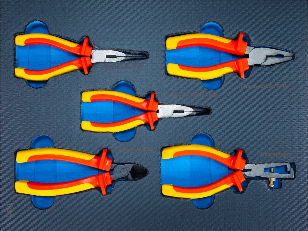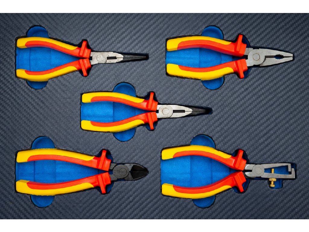 - VDE kleště: 5 ks – štípací kleště, kombinované kleště, prodloužené kleště rovné, prodloužené kleště zahnuté, odizolovací kleště.