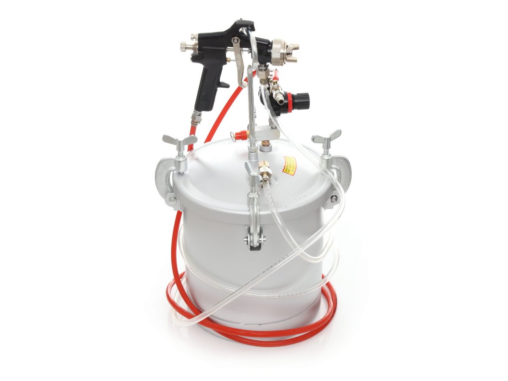 - Jednotka pracuje s pracovním tlakem 3,4 baru, což umožňuje rovnoměrné nanášení barev a laků stlačeným vzduchem.