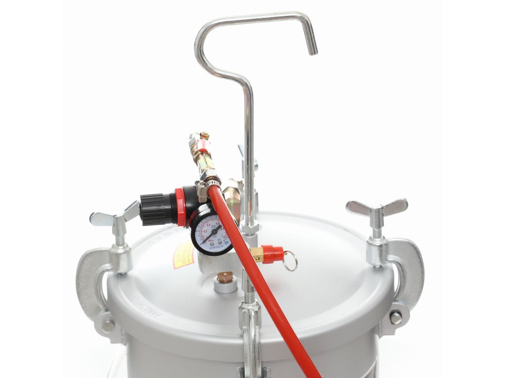 - Hliníková tlaková nádrž o objemu 8 litrů je vybavena regulátorem tlaku s manometrem a bezpečnostním ventilem pro zajištění přesného a bezpečného provozu.