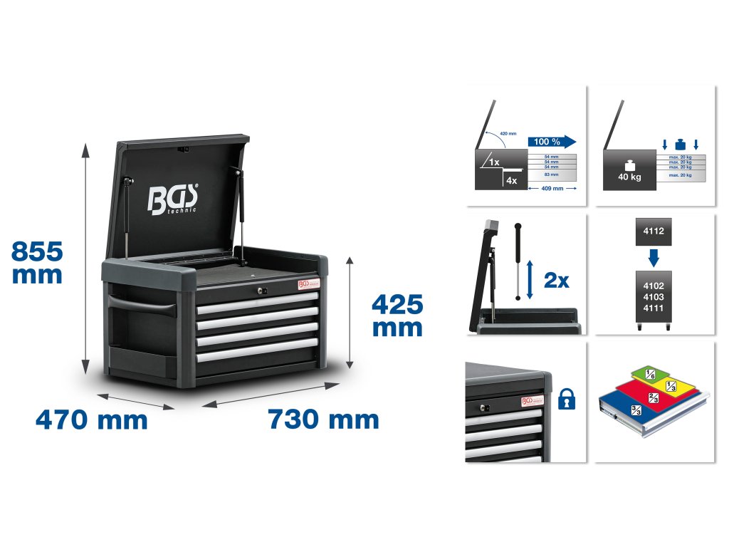 - vhodný jako nástavec pro dílenský vozík BGS4111, BGS4102 a BGS4103