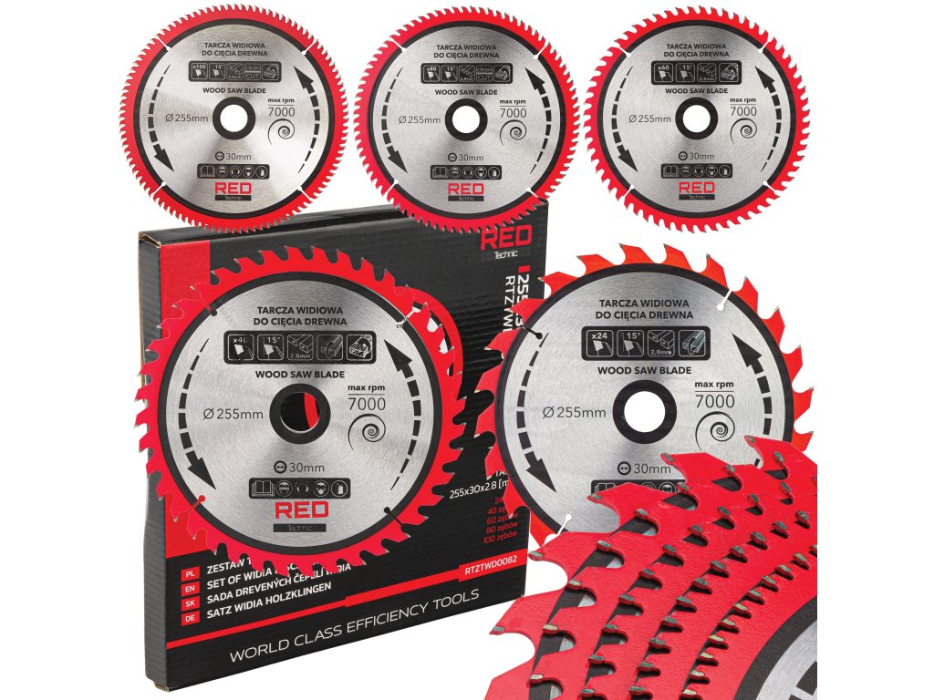 - odolné kotouče z kalené oceli obsahují 24, 40, 60, 80 a 100 řezných zubů
