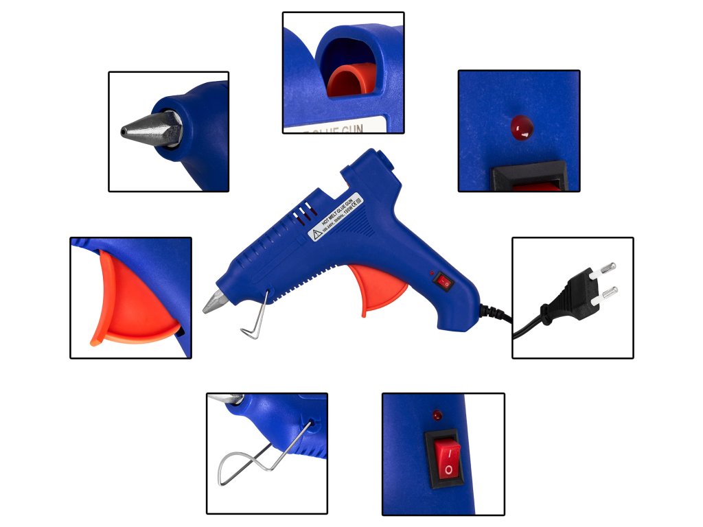 - Příslušenství: Pistole na horké lepidlo, výměnné adaptéry, špachtle, odmašťovací prostředek, lepicí tyčinky