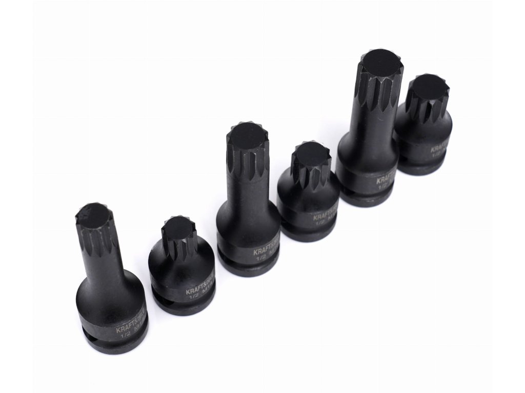 - Sada obsahuje 6 rázových nástrčných hlavic s průměrem 1/2" a šestihrannou koncovkou pro pevné uchycení.