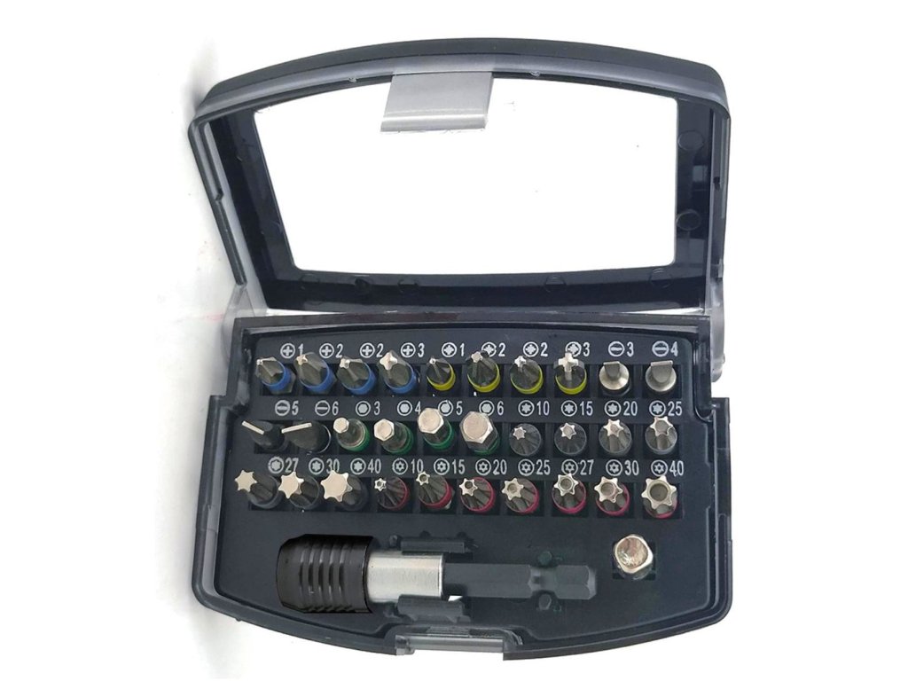32dílná sada bitů v kompaktním plastovém boxupohon 1/4 palce (6,3 mm) šestihran masivníobsahuje plochý, křížový PH, PZ, vnitřní šestihran a TORX® profilyvčetně bitů Tamper...