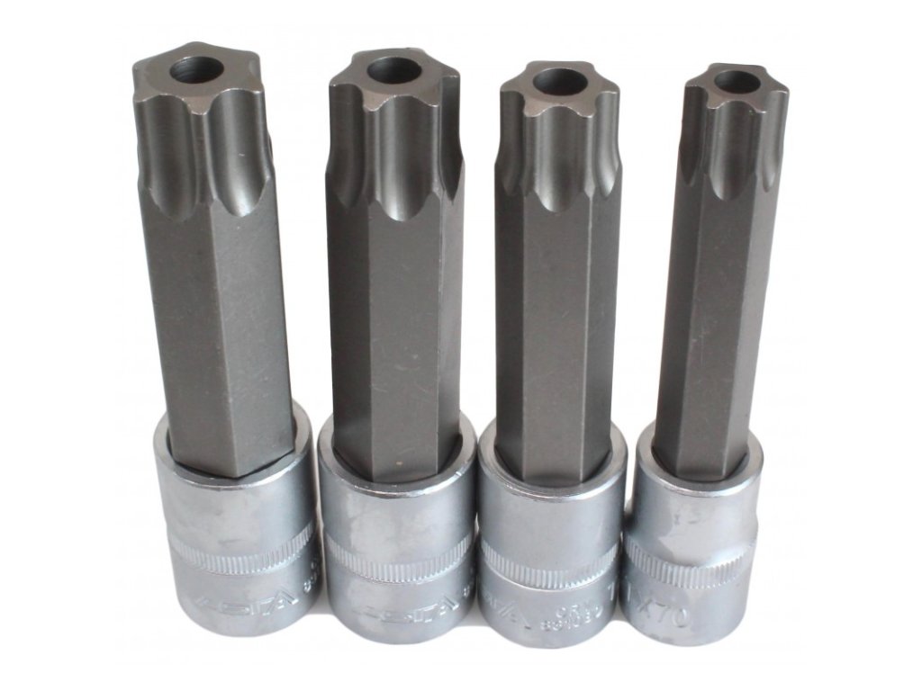 - Nástrčné hlavice: 4 ks různých velikostí Torx hlavic 1/2" Dr.