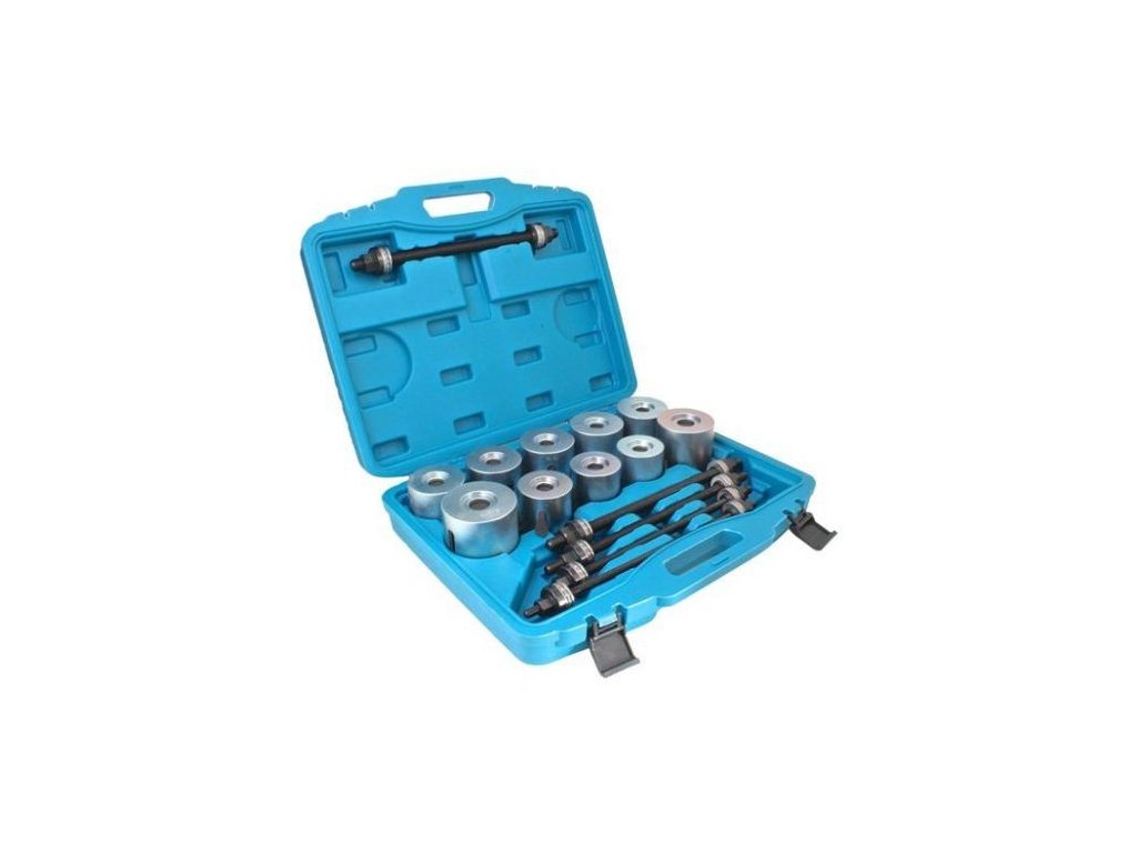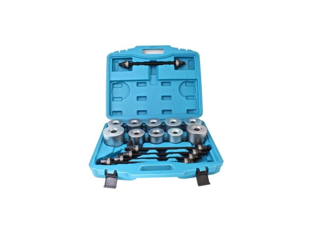 Univerzální sada pro stahování silentbloků. Vhodná pro montáž a demontáž silentbloků. Obsahuje 26 dílů různých rozměrů. Součástí je praktický plastový kufr. Podporuje závity...