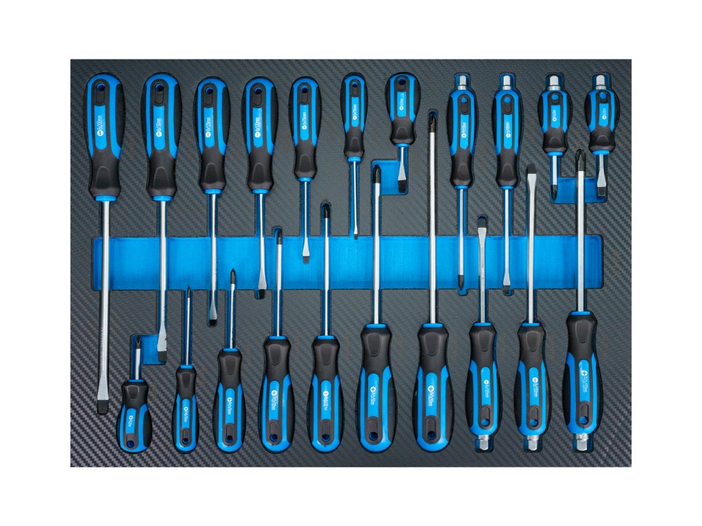 - 7 ks plochých šroubováků: (velikost: SL6x38, 3x75, 5x75, 6x100, 6x125, 8x150, 8x175 mm)