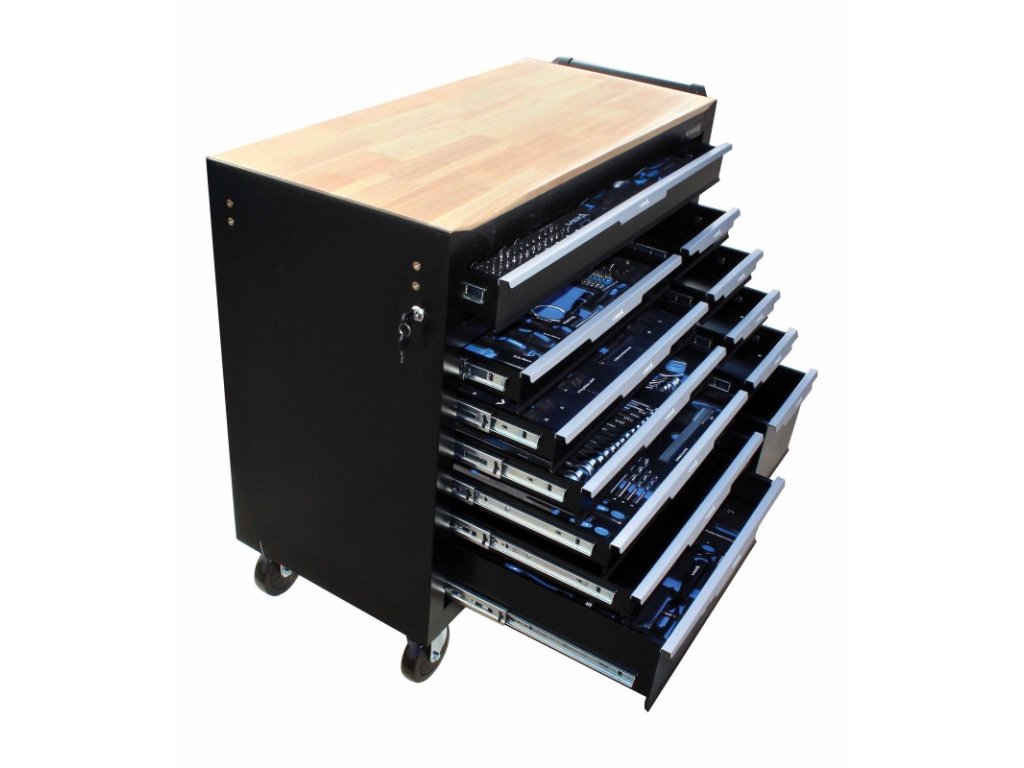kvalitní dílenský vozík s 8 zásuvkami a 299 nástrojis bočním madlem pro snadnou manipulaci