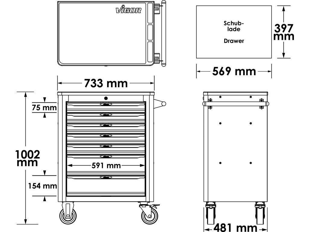 - rozměry zásuvek: 7× (569 × 398 × 75 mm), 1× (569 × 398 × 154 mm)